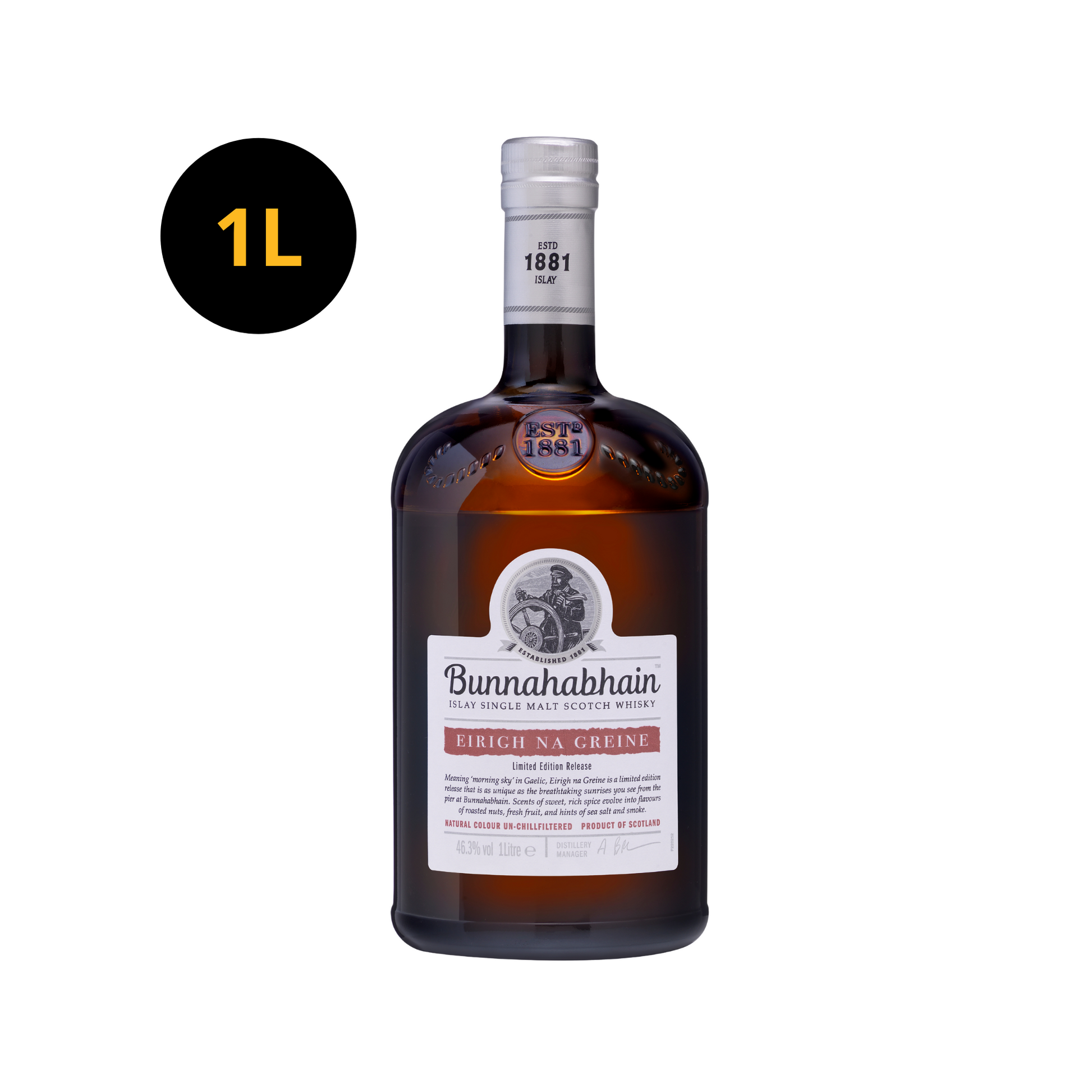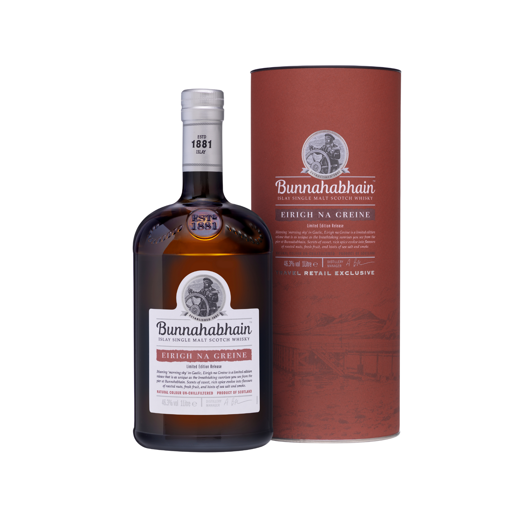 Bunnahabhain Eirigh Na Greine is beautifully presented in its own oak-coloured one-litre bottle with dual front labelling. A rich, deep burgundy-coloured tube – inspired by the aesthetics of Italian and French red wine-growers – helps completes the presentation. The sumptuous amber-liquid gold inside, reminiscent of a burnished dawn sky at Bunnahabhain, arises from a complex recipe, at the heart of which is the blending of some of the finest whiskies ever matured in ex-red-wine casks.