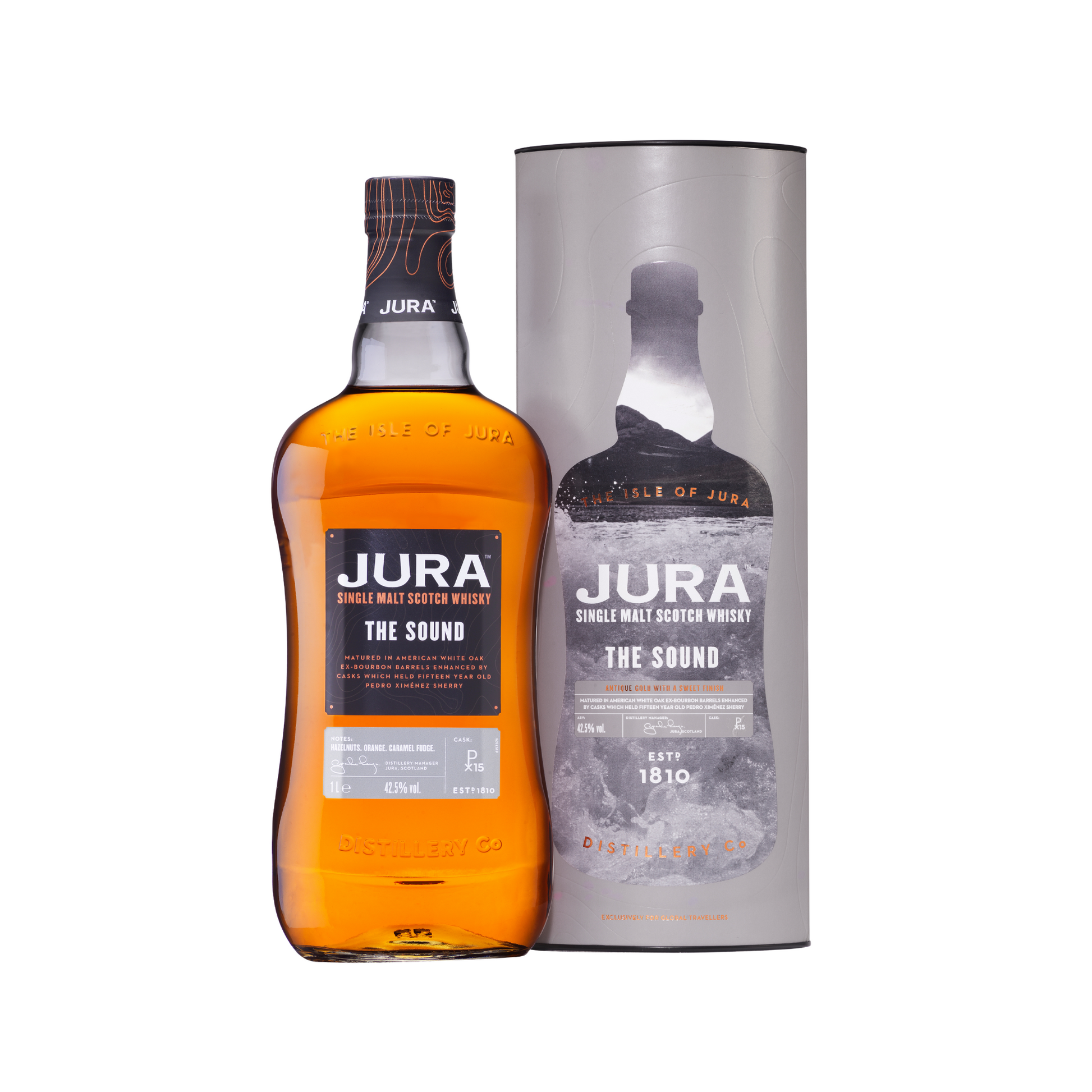 The sound of Jura’s northern strait is home to the Gulf of Corryvreckan: a notorious whirlpool lying in wait for the1308199 unwary. The Sound is matured in American White Oak ex-bourbon barrels and enhanced by a sweet finish from hand-selected fifteen year old Pedro Ximénez Sherry casks.