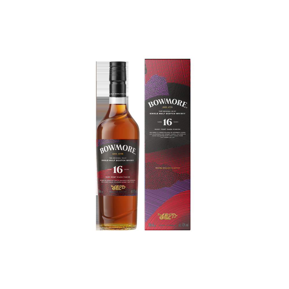 Bowmore 16-year-old Ruby Port Cask is an enchantingly rich and complex Bowmore single malt whisky matured in American Oak ex-Bourbon casks and European Oak Sherry casks, and finished in Ruby Port casks for a unique layer of flavour.